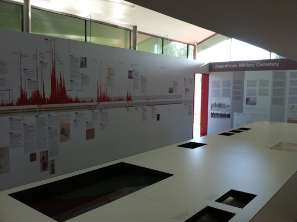 After an early crossing on the Eurotunnel and a smooth journey up to the salient we started by visiting Lijssenthoek cemetery. The new visitor centre is quite minimalist (echoing  the visitor centre at Tyne Cot), but some of the information is very informative, particularly the ‘timeline’ of the burials in the cemetery. They are carrying out a project similar to the one at Thiepval to collect information and photos about the men who are buried there, which is available to view at the visitor centre and online.