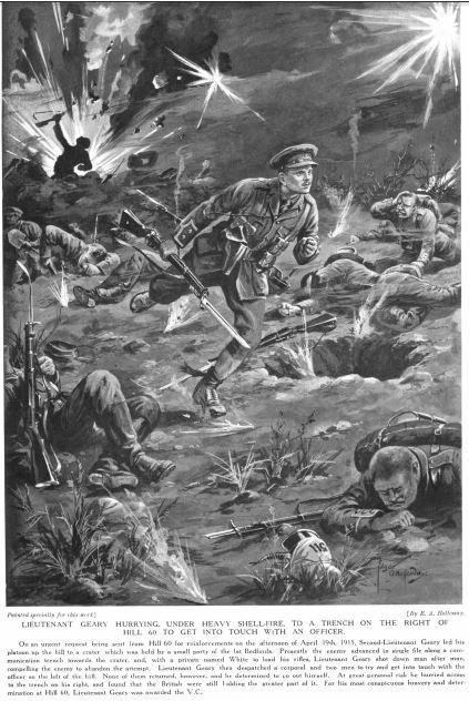 The crater was first exposed to a very heavy artillery fire, which broke down the defences and afterwards, throughout the night, to repeated bomb attacks which filled it with dead and wounded. Each attack, however, was repulsed, mainly owing to the splendid personal gallantry and example of Second Lieutenant Geary. At one time he used a rifle with great effect, at another threw hand grenades and exposed himself with entire disregard to danger, in order to see, by the light of flares, where the enemy were coming on. In the intervals between the attacks, he spent his whole time arranging for the ammunition supply and for reinforcements. He was severely wounded just before daybreak on 21stApril.”