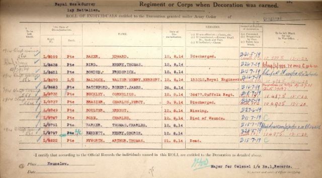 It has been a while since I last posted on here but I’ve been trying to fit in my ongoing research into the 1st Battalion The Queen’s (Royal West Surrey Regiment) when time allows. One project I recently completed was transcribing the 1914 star medal roll for the battalion. The roll lists all the men eligible for the 1914 star, or ‘Mons Star’; the criteria being that they had served in France or Belgium between 5th August and 22nd November 1914, the end of the First Battle of Ypres. The roll lists 1,635 other ranks and 65 officers, giving a total of 1,700 men who served with the battalion during this period. However in this post I want to focus on the fate of the original members of the battalion.