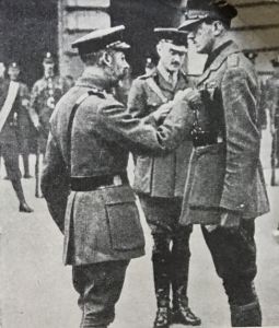The enemy retired in disorder, sustaining many casualties. By his force of will, dash and splendid example, coupled with an utter contempt of danger, this Officer, who has already won the D.C.M. and M.C., infused courage into every man who saw him.’