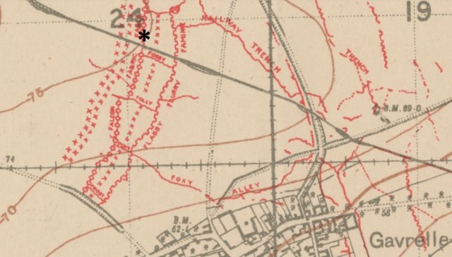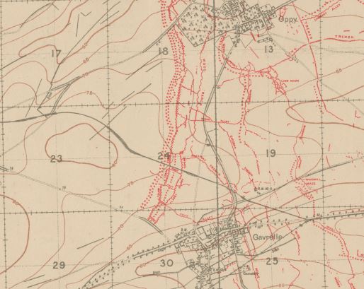 The bar to his MC quickly followed during the Battle of Arras for what The Times called ‘…an audacious reconnaissance of the Oppy-Gavrelle line.’ Pollard’s battalion was part of 63rd Division, which was in reserve at the start of the Battle of Arras. However on 17th April the division was sent forward to relieve the 34th Division, and the 1st HAC advanced to occupy positions close to the German line between Gavrelle and Oppy. Pollard led a patrol towards Gavrelle to reconnoitre the German line. On finding a dugout occupied by Germans the patrol retired, but on regrouping Pollard discovered one man was missing. He and another man went back to try and find him, but were discovered by German sentries and had to quickly withdraw through the German trenches.