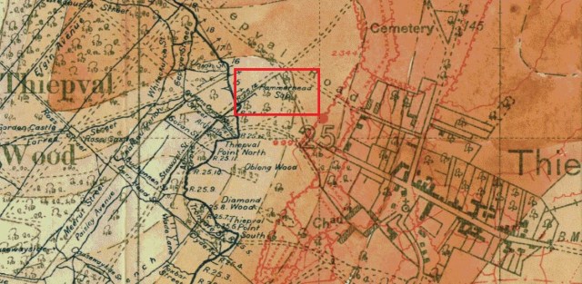 Hammerhead sap was located at the south east corner of Thiepval wood. If you have ever stood at the 18th Division memorial at Thiepval looking down towards the wood, the sap was just in front of the corner of the wood as you are looking at it.