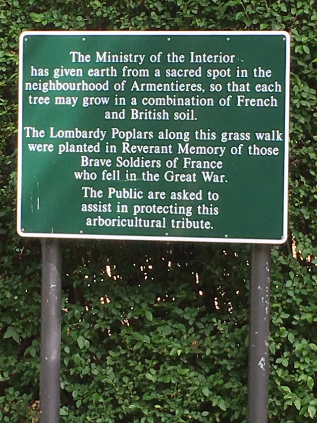 The memorial itself is inscribed “Aux soldats de France mort glorieusement pendant la Grand Guerre” (To the soldiers of France who died gloriously during the Great War). The soil for the trees was brought from near Armentieres, and was reputedly so full of shrapnel and bullets that it had to be sifted several times to prevent souvenir hunters damaging the avenue. The Lombardy poplars that still line the road also came from Verdun.