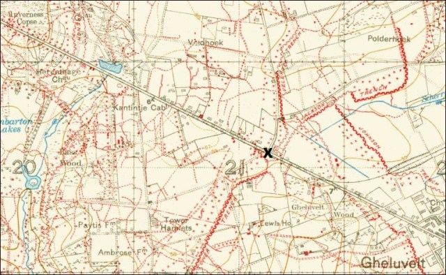 The following day the battalion was located immediately west of the Steenbeek – better known now as the location of the Harry Patch memorial, and suffered only a few casualties. On 23 October the battalion was sent north west of Langemarck and assaulted the Kortekeer Cabaret, an inn that had been taken by the Germans. This was a successful operation in which 60 Cameron Highlanders taken prisoner by the Germans were freed. During the subsequent fighting that day Captain Stanley-Creek’s company was cut off by the Germans, but under the cover of darkness he managed to extricate them in the confusion. For his actions that day he was awarded the DSO.