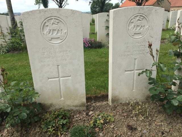 The graves of Private Mates and Private Shute at Messines Ridge cemetery. Both were taken prisoner at Gheluvelt