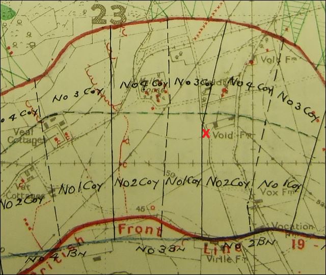 Alfred’s headstoneAlfred’s body was found at map reference V.23.d.7.2 (just to the right of the 11th Border Regiment’s frontage for the attack) in August 1920. Initially the body was not identified, and Alfred was due to be commemorated alongside his fallen comrades on Tyne Cot memorial. However the boots on the body were marked with a service number and text; 50022 MHN (possibly MAN). This was in fact Alfred’s previous service number, as he had initially enlisted with the 4th Manchesters.