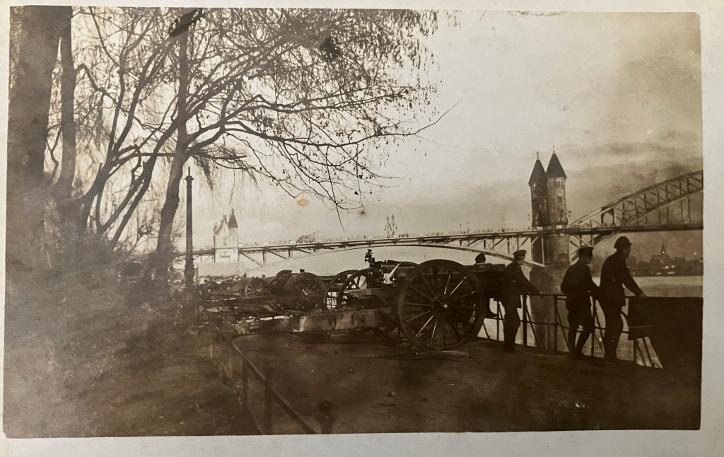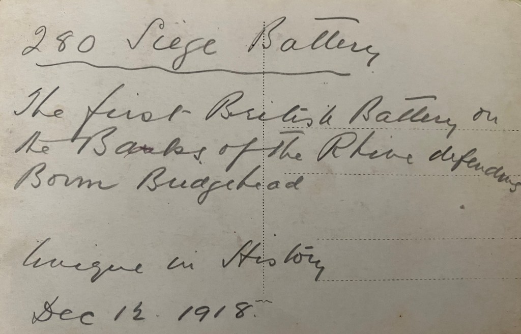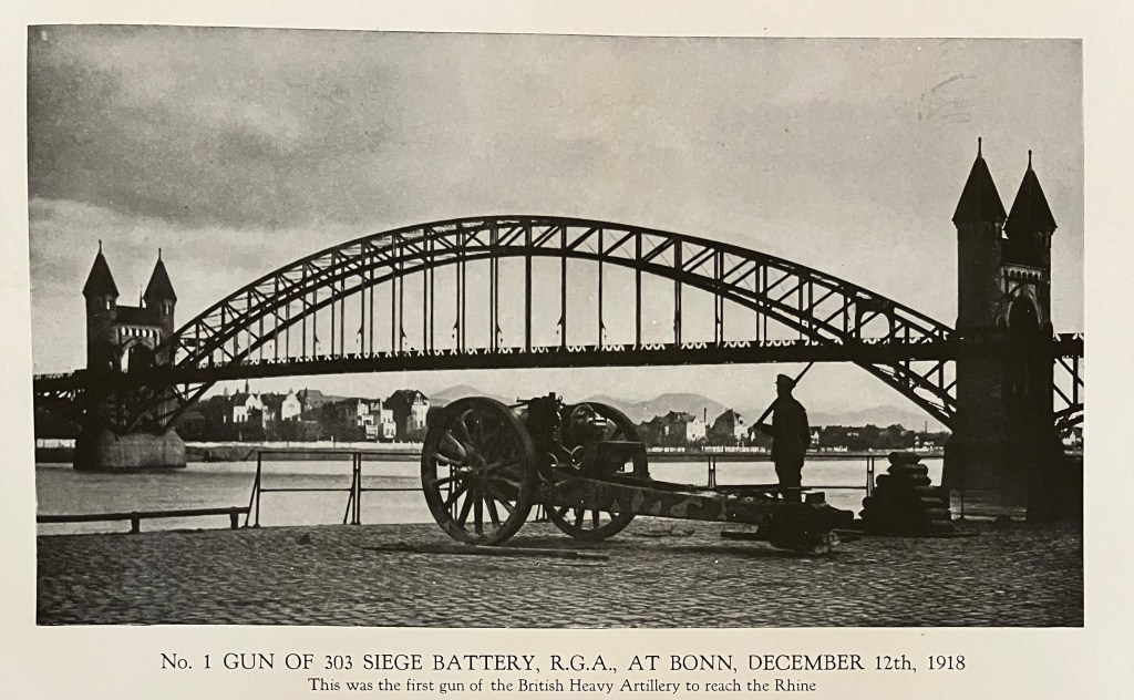 The letter relates to a photo in the book captioned “No.1 gun of 303 Siege Battery, RGA, at Bonn December 12th, 1918. This was the first gun of the British Heavy Artillery to reach the Rhine.”